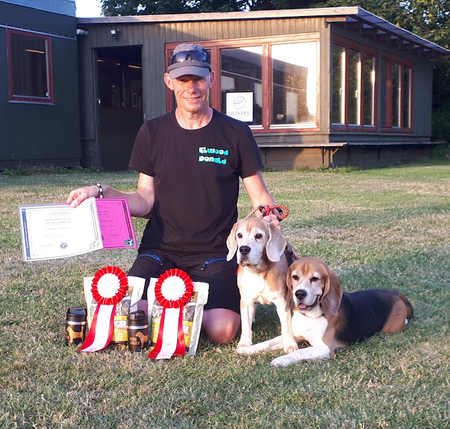 Het ging goed tot hij de geur uit de kantine keuken in de neus kreeg. hij verliet de baan en ging even buurten in de keuken hihih, tja hij liet dus echt even zijn beagle kunsten zien. ook een disk.