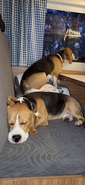 Het koelt af en we gaan in de camper zitten lezen. Cooper neemt weer plaats op zijn uitkijk post en begint weer te Koe keloeren hahaha